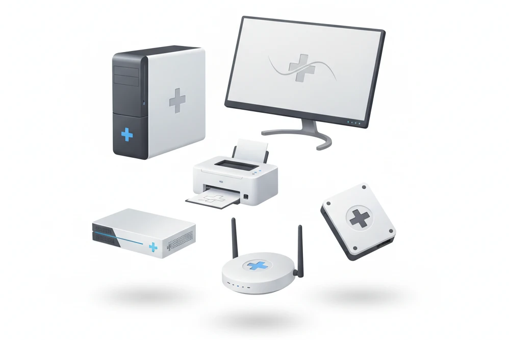 Wir beraten Sie bei Auswahl, Beschaffung und Einrichtung der passenden Geräte – von PCs und Druckern bis zu Netzwerktechnik und Backups.